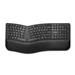 Bezdrátová klávesnice Kensington Pro Fit® Ergo s ergonomickým schválením a rozdělenou a nakloněnou klávesnicí s nastavitelným zpětným náklonem a vestavěnou opěrkou zápěstí umožňuje lepší polohu rukou. Mezi funkce patří duální bezdrátové