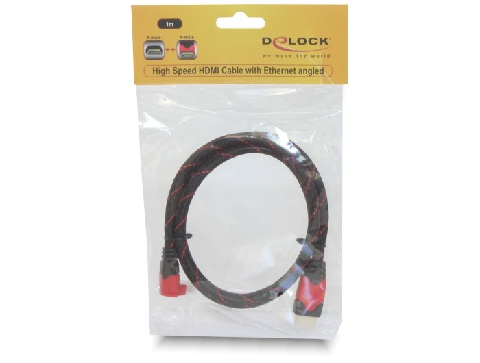 This High Speed HDMI with Ethernet cable by Delock complies with the latest HDMI standard and combines fast data transfer as well as audio-/video- and internet connection. Thus you can connect e.g. your PC or o DVD/Blu-ray drive to a monitor or TV. The angled connector helps to reach also a HDMI port which is difficult to access. The HDMI-A interface is also downwards compatible to its forerunners and enables you to use your existing devices.