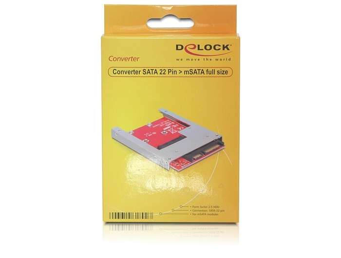 Delock adaptér ve tvaru 2.5" HDD umožňuje připojení mSATA (full size) přes SATA 22 pinový port. Pomocí přiloženého kovového rámečku můžete vložit adaptér do vašeho systému stejně jako 2,5" HDD.