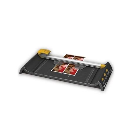 Řezačka papíru s plastovou základnou, velice atraktivní design v kombinaci černá žlutá. Kapacita řezání až 8 listů 80g papíru. Délka řezu 320 mm tj. formát A4. Řezání probíhá tlakem oproti gumovému pásku. Pásek lze dokoupit jako příslušenství (spotřební materiál). Rotační řezné kolečko lze po opotřebení dokoupit v sadě 2 ks. Rovněž kreativní nástroje lze dokoupit v sadě : 1 ks rýhovací kolečko + 1 ks řezné kolečko vlnka + 1 ks řezné kolečko perforace.