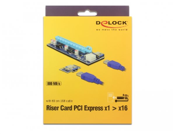 PCI Express riser card od Delocku může být připojena do jakéhokoliv slotu PCI Express x1 na základní desce. Poté může být slot x16 PCI Express umístěn v jiné pozici. To umožňuje pracovat grafické kartě v každém slotu PCIe na základní desce, I když je grafická karta širší než jeden slot. Pomocí několika riser karet může být několik grafických karet provozována současně na jedné základní desce, např. pro sledování krypto měn jako jsou Bitcoin, Ethereum nebo Zcash. Poznámka Obsah balíčku obsahuje riser kabel USB 3.0 s délkou 60 cm. V tomto kabelu nejsou přenášeny žádné signály USB. Proto není možné jej zaměnit jiným nebo delším kabelem. Speciální vlastnosti PCIe x16 grafická karta může být použita ve slotu PCIe x1. Specifikace • Konektor: Strana ze základní desky: 1 x PCI Express x1 1 x USB 3.0 Typ-A samice Strana Riser: 1 x PCI Express x16 1 x USB 3.0 Typ-A samice 1 x 6 pin PCIe napájení samice • Rychlost přenosu dat 800 MB/s • 4 x FP pevné kondenzátory zajišťují bezpečné napájení grafické karty • 4 x montážní díry na riser kartě • Spodní strana s izolační, protiskluzovou podložkou • Datový kabel: 1 x riser kabel USB 3.0 Typ-A samec na samec cca. 60 cm (včetně konektorů) 1 x napájecí kabel 6 pin na SATA cca. 20 cm (včetně konektorů) • Rozměry riser card (DxŠxV): cca. 128,25 x 43,50 x 21,20 mm • Nezávislé na operačním systému, nevyžaduje instalaci žádných ovladačů Systémové požadavky • PC s jedním volným PCI Express x1 / x4 / x8 / x16 / x32 slotem • Napájecí zdroj s volným SATA napájecím konektorem Obsah balení • PCIe na USB riser card • USB na PCIe riser card • USB 3.0 kabel • Napájecí kabel Balení • Kartonová krabice |