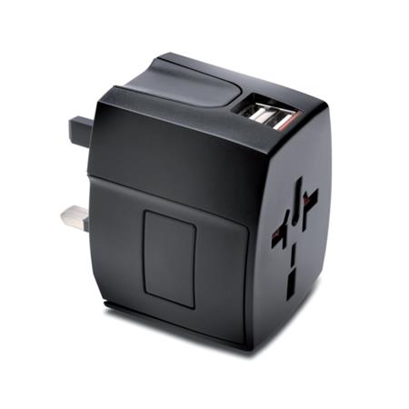 Slide-out plug configurations for USA/Japan, Australia/China, UK and Europe that work in over 150 countries Power a laptop and charge two mobile devices simultaneously 2-pole adapter (does not support grounded 3-prong U.S. plugs) Dual 2.4A USB ports provide fastest charge for smartphones and tablets Plug release button Energy Efficiency Level VI |