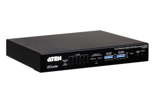 ATEN VE66DTH je zvukové rozhraní se šesti vstupy a šesti výstupy Dante a rozhraním HDMI. Pomocí Dante™ - nejoblíbenějšího síťového audio řešení vytvořeného společností Audinate - je VE66DTH schopen přenášet nekomprimované digitální audio signály s téměř nulovou latencí přes standardní IP síť. VE66DTH vysílá a přijímá až 6kanálové audio vstupy a výstupy prostřednictvím sítě Dante - audio vstupy mohou podporovat nejen linkový vstup, ale také dynamické a kondenzátorové mikrofony současně. Kromě toho může zařízení poskytovat kondenzátorovým mikrofonům také 48V fantomové napájení. Díky vestavěnému napájení PoE (Power over Ethernet) může být VE66DTH napájen kompatibilním zařízením PSE prostřednictvím ethernetového kabelu. Zařízení VE66DTH navíc poskytuje flexibilní zvukové možnosti s funkcí deembedding a embedding zvuku. Dokáže de-embedovat stereofonní audio signály HDMI do síťového systému Dante a vkládat audio signály Dante do výstupu HDMI.