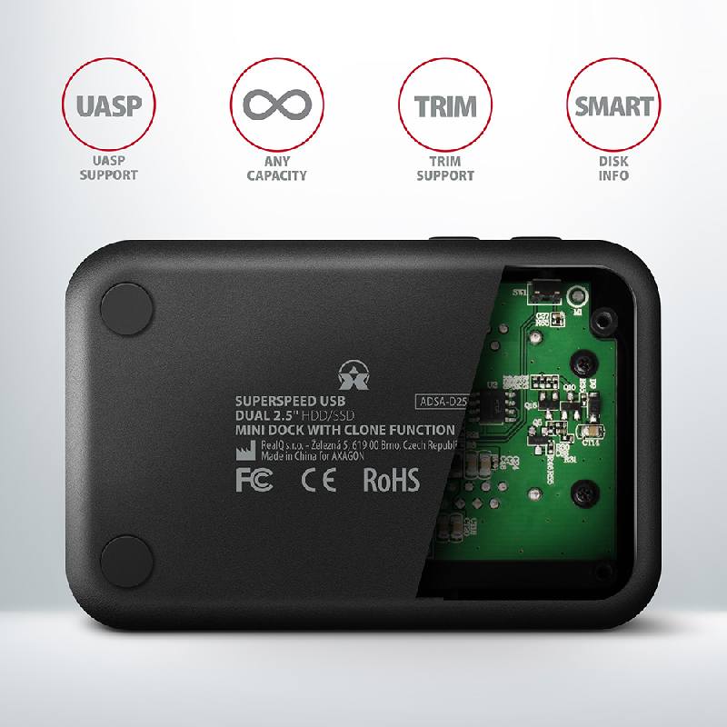 SuperSpeed USB 5 Gbps dokovací / klonovací stanice AXAGON ADSA-D25 CLONE MINI připojí k počítači snadno a rychle až dva 2.5" disky současně. Připojení k počítači umožňuje USB Micro-B konektor na doku spolu s dodávaným kabelem USB Micro-B --- USB-A.
