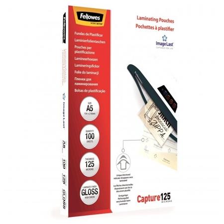 Capture125. Zachytí a zvýrazní barevnost a celkový vzhled vašich dokumentů. Zajistí mechanickou ochranu při časté manipulaci a ochrání proti nečistotám a vlhkosti. Prvotřídní laminovací fólie lesklé Fellowes ImageLast s šipkou směru laminace a logem, které po průjezdu nahřátým laminátorem vymizí. Vymizení znaků vás ujistí o optimální kvalitě laminace. Správná teplota laminátoru aktivuje lepivou složku fólie. Fólie je vyrobena s přesahem cca 3 mm na všech stranách oproti standadním formátům papíru. Vhodné pro laminaci za tepla pro všechny druhy stolních laminátorů. Doporučení nastavení teploty pro optimální laminaci: 125mic (110-120°C)