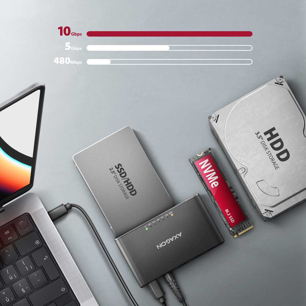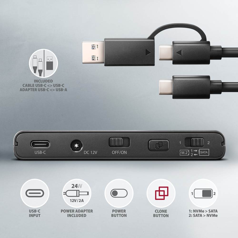 USB 3.2 Gen 2 adaptér pro připojení NVMe M.2 SSD a SATA 2.5"/3.5" disků s funkcí klonování.
