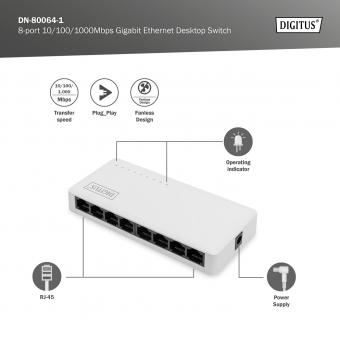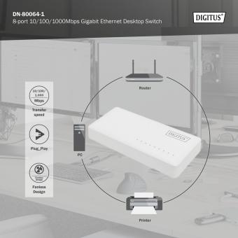 8portový gigabitový ethernetový přepínač, nespravovaný, stolní počítač