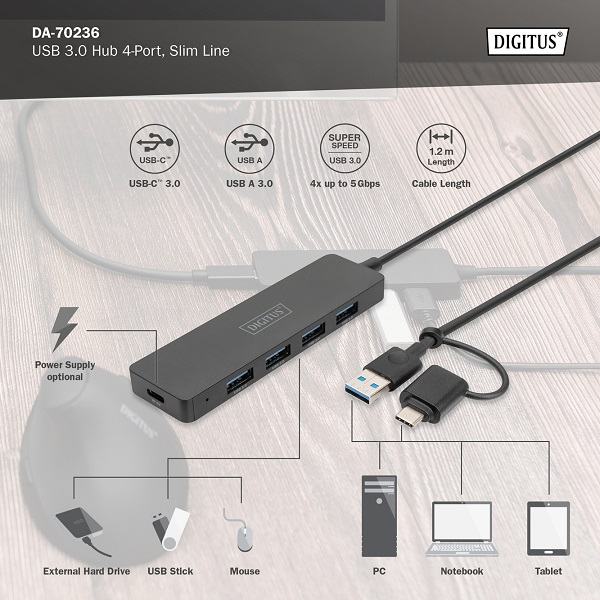 Rozbočovač USB 3.0, 4 porty, tenký s adaptérem USB-C, 5 Gb/s, 1,2 m kabel