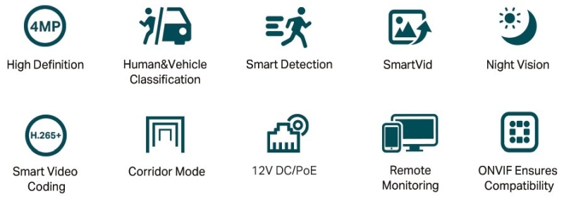 VIGI C440I(4mm) je základní 4 megapixelová Turret kamera značky TP-Link určená pro vnitřní použití s fixním objektivem 4 mm, IR přísvitem do 30m vzdálenosti a ethernetovým portem s 802.3af PoE. Kamera má max. rozlišení 2560 × 1440 px (při 30 fps), pozorovací úhel 75°, 2 nezávislé streamy, digitální WDR snímač, podporu ONVIF a kodeku H.264(+) včetně H.265(+).