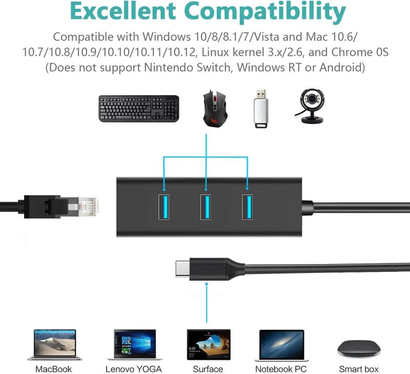 Převodník, který umožní připojit Váš počítač s portem USB typu C do internetu nebo k lokální síti pomocí kabelu s RJ45 a navíc umožňuje zapojit tři USB3.0 periferie jako USB disk, tiskárnu, klávesnici a myš Adaptér je vhodný pro počítače, zpravidla notebooky, které nedisponují ethernetovým portem RJ45, či pokud se Vám rozbije port na základní desce, jako jeho snadná náhrada. - Podpora rychlostí 10/100/1000Mbps. - 3x USB3.0 umožňující zapojení tří periferií s rychlostí až 5 Gbps - Podpora kabelů na propojení Cat5 a Cat6 kategorií. - Maximální rychlost USB-C - Super speed 5 Gbps. - Kovové pouzdro a kovový kryt konektoru - Typ C konektor s možností zapojení v jakémkoliv směru. - Nevyžaduje instalaci ovladačů. - Chipset: RTL8153+GL3510 - Kovové hliníkové pouzdro adaptéru a konektoru - Barva: metalická - Délka: 15cm. Podpora systémů : Windows XP, Vista, 7, 8, 10, 11 / Mac OS 10.6 nebo novější |