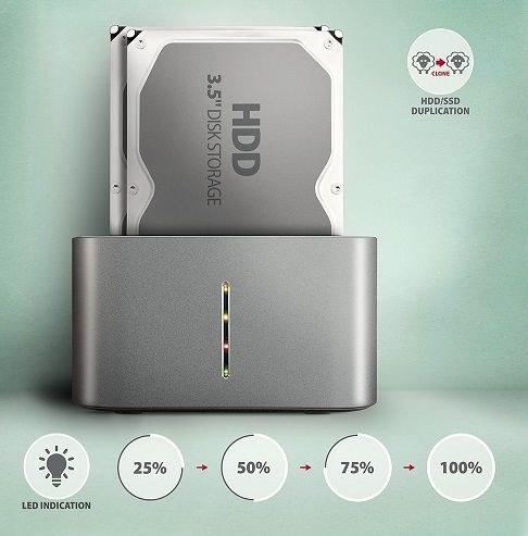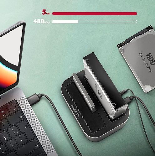 SuperSpeed USB-C 5Gbps dokovací / klonovací stanice AXAGON ADSA-DC DUAL CLONE připojí k počítači snadno a rychle až dva 2.5" nebo 3.5" disky současně. Připojení k počítači umožňuje moderní oboustranný USB-C konektor na doku spolu s dodávaným kabelem USB-C --- USB-A o délce 80 cm. Tento šikovný pomocník vám tak umožní nejjednodušší připojení 2.5"/3.5" SATA disků k počítači nebo notebooku. Jeden nebo i dva disky současně jen stačí zasunout do základny, nejsou potřeba žádné nástroje ani doplňky. Výměna disků je tak velmi rychlá a jednoduchá. Dokovací stanici také využijete pro snadné klonování obsahu připojených disků bez potřeby připojení k PC. Do prvního slotu stanice HDD A (source) zasunete zdrojový disk a do druhého slotu HDD B (target) zasunete cílový disk. Pak jen zmáčknete klonovací tlačítko a sledujete průběh klonování na stupnici čtyř LED diod. Po zkopírování všech dat je na cílovém disku přesná kopie původního disku. Dock tak lze využít jako autonomní zařízení pro pohodlné duplikování a vytváření obrazů disků. Jedná se o nejjednodušší způsob, jak přenést obsah například starého HDD disku na nový SSD disk, a to včetně funkčního operačního systému (Windows, macOS, Linux …). Rozhraní SATA 6G s podporou UASP dovolí užívat si rychlost moderních SSD disků. Podpora funkce TRIM pro omezení pozvolné degradace výkonu SSD v čase. Stanice umožňuje čtení S.M.A.R.T. informací monitorujících kondici HDD/SSD. Podporuje usínání připojených disků i stanice. Skříň stanice je dostatečně robustní a odolná, což umožňuje dokonalou stabilitu i s vloženými disky. Gumové nožky omezují posouvání po stole a vibrace pevných disků. Vnější plášť je proveden z hliníku s elegantním broušeným povrchem. Vstup: • USB-C 5Gbps (USB 3.2 Gen 1 / USB 3.0). • Rychlost až 5 Gbit/s. • Připojení přes USB-C female konektor. Podpora zařízení: • Rozhraní SATA III - 6 Gb/s (600 MB/s). • Podpora 2.5" HDD/SSD. • Podpora 3.5" HDD. • Max. kapacita disku - všechny bez omezení. • Max. výška 2.5" disku - všechny bez omezení. Vlastnosti: • Kompatibilní s USB 3.2 Gen 2 (USB 3.1 Gen 2) a zpětně kompatibilní s USB 2.0. • Podpora přenosových rychlostí 5000 / 480 Mbit/s. • Vyhovuje Serial ATA 3.0 specifikaci (SATA/600), přenosové rychlosti až 6 Gb/s (600 MB/s). • Vyhovuje Serial ATA 2.0 specifikaci (SATA/300), přenosové rychlosti až 3 Gb/s (300 MB/s). • Vyhovuje Serial ATA 1.0 specifikaci (SATA/150), přenosové rychlosti až 1.5 Gb/s (150 MB/s). • Celková propustnost / přenosová rychlost stanice je dána použitým USB rozhraním (teor. 5 Gbit/s). • Vyhovuje USB Mass Storage Class specifikaci. • Podpora BOT (Bulk-Only Transport). • Podpora UASP (USB Attached SCSI Protocol) pro rychlejší přenos dat ve Windows 8 a novějších. • Podpora funkce TRIM pro omezení pozvolné degradace výkonu SSD v čase. • Podpora S.M.A.R.T. (Self-Monitoring, Analysis, and Reporting Technology) systém monitorující stav disku. • Podpora bootování z HDD/SSD v dokovací stanici. • Možnost připojení zařízení za chodu díky podpoře Hot Plug. • Plná podpora Plug and Play. • HDD Auto Spin down - vypínání disků při nečinnosti. • HDD Turn Off - vypnutí disku po odebrání zařízení nebo uspání PC. • Připojení přes USB-C female konektor. • Kabel USB-C --- USB-A délky 80 cm je součástí balení. • LED indikující napájení HDD/SSD docku a aktivitu disků v obou šachtách. • Rozměry stanice 130 x 97 x 73 mm. • Hmotnost 307 g. Napájení: • Napájení pomocí přiloženého externího AC/DC adapteru 12V – 2.5A (30W) s kabelem délky 150 cm. • Vypínač napájení. Funkce klonování obsahu disku: • Klonování probíhá bez připojení stanice k počítači. • Cílový disk musí mít stejnou nebo větší kapacitu jako disk zdrojový, jinak nelze klonování spustit. • Klonovat lze jak pevné disky HDD tak SSD. • Rychlost klonování SSD až 300 MB/s. • Celkový čas naklonování disku závisí na kapacitě zdrojového disku, ne na objemu dat na disku. Podporované operační systémy: • Windows, macOS, Linux, Chrome OS. Balení obsahuje: • HDD/SSD dock, • USB-C --- USB-A kabel délky 80 cm, • napájecí adapter 100-240V / 12V-2.5A, • vícejazyčný návod CZ / DE / DK / ENG / ESP / FIN / FR / GR / HR / HU / IT / NL / PL / PT / RO / RU / SK / SWE / TR / BG / CN / ARA, • baleno v kartonové krabičce. Technická specifikace Vstup rozhraní USB 3.2 Gen 1 / USB 3.1 Gen 1 / USB 3.0 / USB 2.0 rychlost 5.000 / 480 Mbit/s ( super speed / high speed) konektor USB type C samice (na docku) konektor USB type A samec (na kabelu do pc) kabel 80 cm Výstup rozhraní Serial ATA 3.0 konektor 2x 22-pin SATA datový a napájecí samice kompatibilita všechny SATA I / SATA II / SATA III disky celková propustnost 5 Gbit/s teor. (dána USB 3.0 vstupem) Podporované zařízení 2.5" ano 3.5" ano max. kapacita disku všechny, bez omezení max. výška 2.5" disku všechny, bez omezení Podporované vlastnosti klonování disků ano UASP ano TRIM ano S.M.A.R.T. ano boot z připojeného disku ano automatická instalace ano Plug and Play ano Hot Plug ano Další vlastnosti provedení kov bezšroubková montáž ano indikace LED ovládací prvky tlačítko CLONE - spouští klonování disků rozměry 130 x 97 x 73 mm hmotnost 307 g Napájení po sběrnici ne napájecím adaptérem ano Podpora OS MS Windows 11 / 10 / 8.1 / 8 / 7 Mac OS X 10.x a vyšší Linux 2.6.x jádro a vyšší |