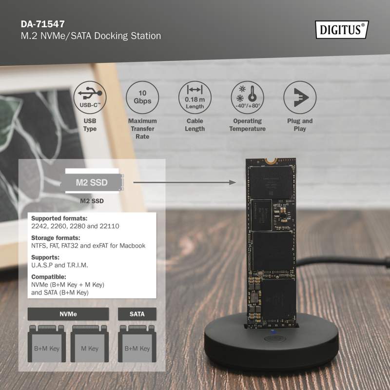 Spravujte M.2 NVMe a M.2 SATA SSD pomocí připojení USB-C™ Podporuje SATA M.2. B+M Key SSD a NVMe M Key SSD Podporované formáty: 2242, 2260, 2280 a 22110 Podporuje karty NVMe a SATA SSD až do kapacity 4 TB Vysoká rychlost přenosu dat až 10 Gbps (podpora UASP + TRIM) Připojení USB-C™: USB 3.2 Gen2 Ideální rozšíření úložiště pro notebooky, počítače, herní konzole, televizory, NAS nebo routery (USB-C™) Plug and Play, není nutná instalace ovladače POPIS Dokovací stanice SSD od společnosti DIGITUS® pojme M.2 SSD v technologii NVMe nebo SATA s kapacitou až 4 TB. Podporuje NVMe SSD s B+M Key & M-Key a SATA SSD s B+M-Key, každý ve formátech 2242, 2260, 2280 a 22110. Snadno rozšiřte úložnou kapacitu mnoha USB-C™ zařízení, jako jsou PC, notebooky, televizory, herní konzole nebo routery. TECHNICKÉ ÚDAJE 1 x M.2 slot pro NVMe / SATA SSD (B+M-Key / M-Key) Podporované formáty: 2242, 2260, 2280 a 22110 Kapacita: max. 4 TB Připojení USB-C™: 1 x Data USB-C™ 3.2 Gen2, 1 x napájecí konektor USB-C™ Zpětně kompatibilní s USB 3.0 / USB 2.0 Maximální přenosová rychlost USB-C™: 10 Gbps Podporuje UASP a TRIM Podporuje Hot Swap (zapojit a vysunout během provozu) LED indikátory pro přenos pevného disku (modrá) a napájení (modrá) Aplikace PC, notebook, TV, router nebo herní konzole (s připojením USB-C™) Formáty úložiště: NTFS, FAT, FAT32 Systémy: Windows 11/10/8/8.1/7/XP, macOS 10.0 nebo vyšší Připojovací kabel o délce 18 cm Rozměry: Š: 6 x H: 6 x V: 1,45 cm Hmotnost: 40 g Materiál: hliník + ABS Černá barva Provozní teplota: -40°C ~ 80°C Poznámky výrobce: Ne všechny porty USB-C™ podporují všechny funkce standardu USB Type-C™. Ujistěte se, že port USB-C™ vašeho notebooku podporuje DisplayPort Alternate Mode (režimy DP-Alt) a také USB Power Delivery (PD). OBSAH BALENÍ 1 x SSD dokovací stanice 1 x Průvodce rychlým startem |