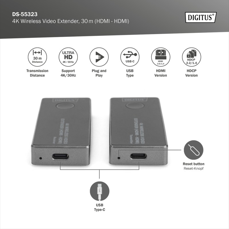 Bezdrátově přenáší HDMI video a audio signály v UHD 4K/30Hz na vzdálenost až 30 m s ničím nerušeným výhledem Bezdrátový přenos signálu HDMI až na vzdálenost 30 m (nerušený výhled) Point-to-point připojení - 1x vysílač (zdroj) + 1x přijímač (výstupní zařízení) Podporuje rozlišení až 4K UHD (2160p/30Hz) Snadná obsluha a manipulace díky Plug & Play - Stačí zapojit a začít, není potřeba žádný ovladač ani software Napájení přes USB-C připojení 128bitové šifrování AES protokol WPA2 HDMI 2.0/1.4 HDCP 2.2/1.4 POPIS Zažijte bezdrátový přenos zvuku a videa v ostrém rozlišení UHD 4K/30Hz s 4K Wireless HDMI Extender. Sada je navržena pro snadné nastavení bez ovladače nebo softwaru díky Plug & Play. S dosahem až 30 metrů s ničím nerušeným výhledem zaručuje spolehlivý přenos. Šifrování AES 128 a protokol WPA2 zajišťují bezpečný přenos dat. Kompatibilní s HDMI 2.0/1.4 a HDCP 2.2/1.4. To je ideální pro domácí kina, konferenční místnosti a školicí zařízení. Objevte svobodu bezdrátové zábavy! TECHNICKÉ ÚDAJE Bezdrátový přenos signálu HDMI až na vzdálenost 30 m (nerušený výhled) Point-to-point připojení - 1x vysílač (zdroj) + 1x přijímač (výstupní zařízení) Podporuje rozlišení až 4K UHD (2160p/30Hz) Snadná obsluha a manipulace díky Plug & Play - Stačí zapojit a začít, není potřeba žádný ovladač ani software Napájení přes USB-C připojení 128bitové šifrování AES Autentizační protokol: WPA2 (WPAS-PSK / WPA2-Enterprise) Verze HDMI: 2.0 (RX) / 1.4 (TX) Verze HDCP: 2.2 (RX) / 1.4 (TX) Bezdrátový kanál: IEEE 802.11.b/g/n/ac Frekvenční pásmo: Dual Band, 2,4/5G Připojení na jednotku: 1x HDMI konektor, 1x USB-C jack Tlačítko připojení s LED stavovým displejem Napájení: Vysílač - 5V/1A, Přijímač - 5V/0,6A Komprese: H.265 Latence: cca. 100 ms Formát zvuku: PCM Zvukový kanál: 2 kanály Podporuje zdroje signálu (např. herní konzole, Blu-Ray přehrávače atd.) s výstupem HDMI a také PC/notebooky s Windows, macOS ABS pouzdro Spotřeba energie: Vysílač cca. 3W, přijímač cca. 4W Provozní teplota: 0-40 °C Rozměry (1 ks): D 8,1 x Š 3,4 x V 1,3 cm Hmotnost: Vysílač 31 g, přijímač 28 g Barva: černá/stříbrná Přenosovou vzdálenost s omezeným viditelným dosahem nelze obecně určit a závisí na konkrétních okolnostech v místě instalace Stěny, sklo atd. zkracují dosah signálu nebo způsobují ztráty signálu KVM: ne PoE (Power over Ethernet): ne OBSAH BALENÍ 1x Vysílací jednotka 1x Přijímací jednotka 2x kabel USB-A na USB-C (100 cm) 2x prodlužovací kabel HDMI (12,5 cm) 1x QIG |