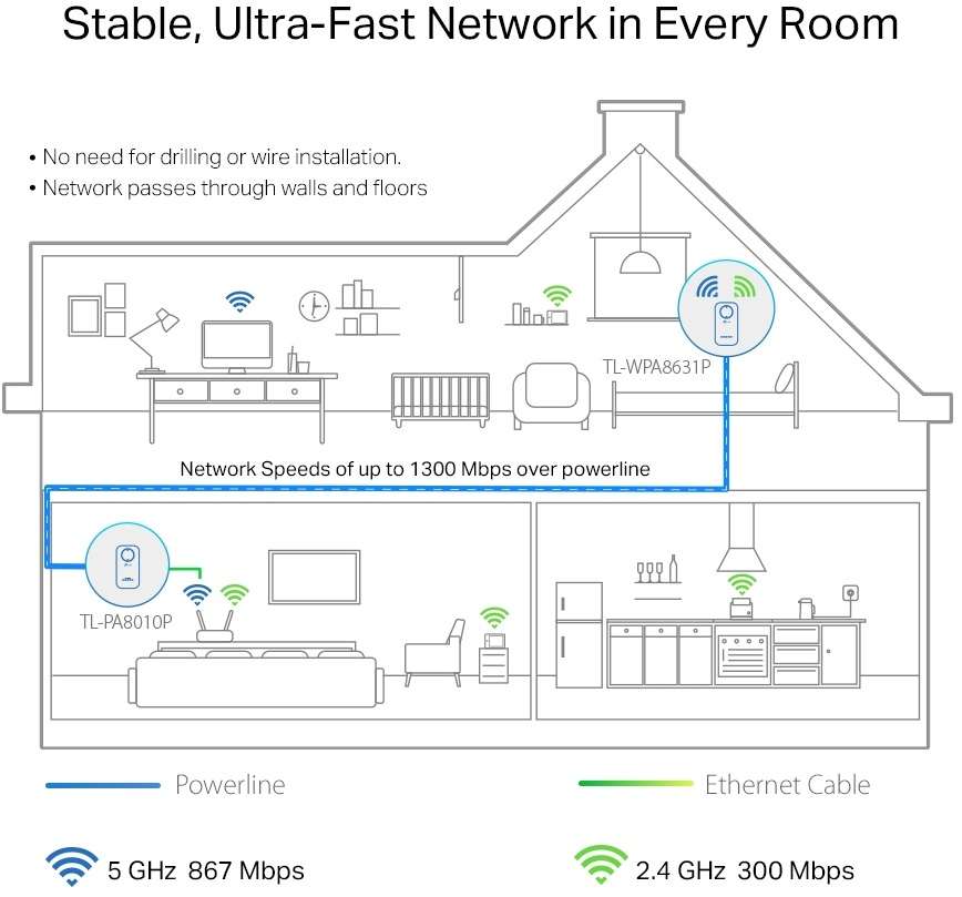 Adaptéry WPA8631PKIT používají pokročilou technologii HomePlug AV2, aby poskytovaly stabilní a vysokorychlostní WiFi síť a současně i kabelové připojení. Jsou však zpětně kompatibílní i se zařízeními HomePlug AV. Přenosová (modulační) rychlost je až 1 300 Mbit/s přes elektrické rozvody na vzdálenost až 300 metrů. Streamujte HD obsah, hrajte online hry a stahujte velké soubory bez přerušování díky spolehlivému připojení k síti Powerline. Praktické provedení přináší další dvě výhody. Jsou k dispozici hned tři gigabitové ethernet porty a nepřijdete o žádnou AC zásuvku, protože oba adaptéry jsou průchozí.