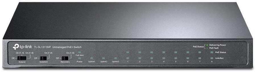 Switch značky TP-Link s označením TL-SL1311MP je velmi jednoduchý nemanagovatelný PoE switch s 8× 10/100 Mbps LAN, 2× Gigabit LAN uplink porty a jedním SFP portem. Switch podporuje napájení PoE 802.3af/at zařízení jako jsou kamery, VoIP, AP na prvních 8 portech s maximálním odběrem zařízení 30 W/port, maximálně 124 W na všech osmi portech současně. První 4 porty umožňují díky přepínači i long-range PoE a to až na vzdálenost 250 m, což je dosaženo ponížením linkové rychlosti na 10 Mbps.