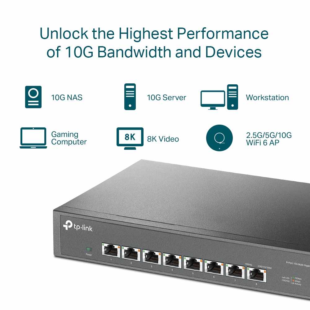 Osm portů 10 Gbit/s. Osm 10gigabitových portů umožňuje využít nejvyšší výkon 10G/multigigabitové šířky pásma a zařízení a poskytuje kapacitu přepínání až 160 Gbit/s. Bleskurychlé připojení. Zajišťuje bleskurychlé připojení k úložišti NAS 10G, serveru, síťové kartě / adaptéru PCIe 10G, hernímu počítači, přístupovému bodu 2.5G/5G/10G Wi-Fi 6, 8K videu a dalším aplikacím. Ideální pro různé situace. Navrženo pro bleskurychlé připojení ve firemních a domácích kancelářích, na pracovních stanicích, LAN party a také pro domácí zábavu. Optimální 5rychlostní připojení. Funkce automatického vyjednávání rychlostí 5rychlostního připojení (100 Mbit/s / 1G / 2.5G / 5G / 10G) nabízí optimální výkon. Tichý provoz. Inteligentní správa rychlosti ventilátoru udržuje hluk na minimu, aby zařízení během provozu uživatele nerušilo. Široký rozsah provozních teplot. Odolné kovové pouzdro a sofistikovaná konstrukce odvodu tepla zajišťují spolehlivé používání v širokém rozsahu provozních teplot (0–50 °C). Zapojení „Plug and Play“ Umožňuje snadné nasazení bez asistence technika. |
