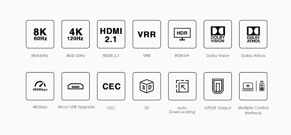 4 HDMI zařízení sdílí 1 HDMI výstupní zařízení (obrazovku). Výběr zařízení tlačítkem nebo dálkovým ovládáním. - HDMI rolišení 8K@24/25/30/50/60Hz, 4K@24/25/30/60/100/120Hz, 1080p/1080i - Podporuje datový tok 48Gbps a frekvenci až 1200MHz - Rozlišení: 7680x4320@24/25/30/50/60Hz, 4096x2160@24/25/30/50/60/100/120Hz, 3840x2160@24/25/30/50/60/100/120Hz, 3440x1600@60Hz, 3440x1440@60Hz, 2560x1600@60Hz, 2560x1440@60/100/120Hz, 2560x1080@60Hz, 2048x1080@60Hz, 1920x1440@60/100/120Hz, 1080p@50/60/100/120Hz, 1080i@50/60Hz, 720p@50/60Hz - Podporuje standard HDMI2.1 - Podporuje standard HDCP2.3 a nižší - Podporuje (High Dynamic Range Imaging) HDR10+, HDR10, Dolby Vision - Vstupní konektory: 4 x HDMI - Výstupní konektor: 1 x HDMI - Zvukový výstup S/PDIF podporuje: Dolby Atmos, Dolby True HD,DTS:X,DTS-HD - HDMI zvukový výstup podporuje: Dolby Atmos,Dolby Digital 7.1CH,Dolby True HD,DTS:X DTS-HD,LPCM 7.1CH - Výběr vstupu tlačítkem nebo dálkovým ovládáním, pomocí RS232 - Plug-and-play, není třeba software. - V sadě dálkové ovládání pro komfortní obsluhu - Podpora 3D obrazu - Přídavný adaptér 230V/5V, 1A v sadě - Spotřeba max. 2W - Pracovní teplota: -20 až 60 °C - Relativní vlhkost: 0-90% - Rozměry: 160mm x 58mm x 20,6mm - Váha: 275g - Pouzdro kovové - Barva: černá |