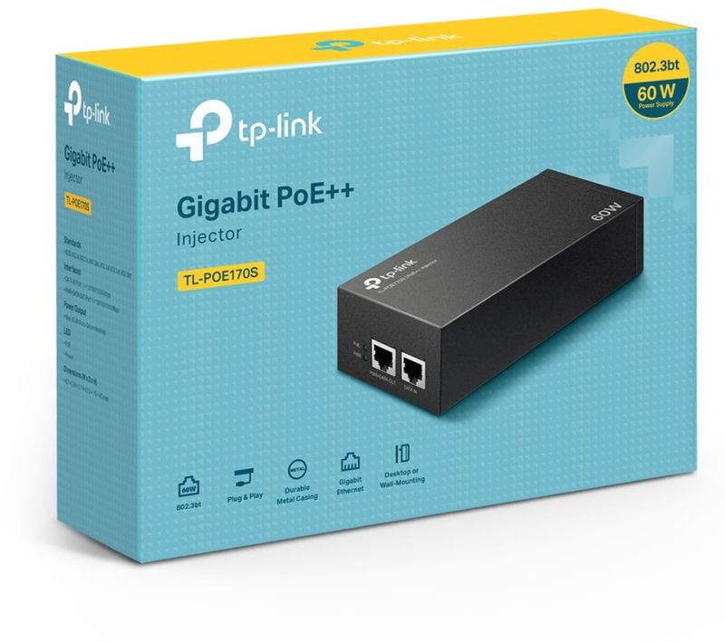 TL-POE170S je velmi robustní Gigabitový napájecí PoE injektor, který podporuje 802.3af/at/bt standardy s výkonem až 60 W, což je vhodné řešení pro napájení PTZ kamer, LED panelů, výkonější Wi-Fi AP a dalších zařízení. Injektor má LED indikaci, euro napájecí konektor na 230 V a dva RJ-45 porty z nichž první je určen na DATA a druhý na DATA + napájení.