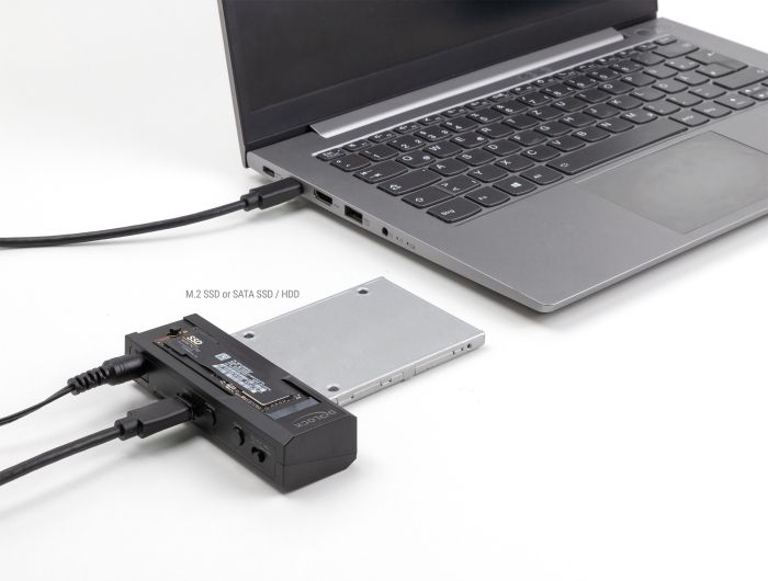 Tento převodník značky Delock umožňuje připojení SSD M.2 NVMe nebo SATA, ve formátu 2280, 2260, 2242 a 2230, nebo HDD nebo SSD 2.5” nebo 3.5” SATA přes rozhraní USB. Technické detaily Konektor: 1 x USB 10 Gbps USB Type-C™ samice 1 x M.2 klíč M slot 1 x SATA 6 Gb/s 22 pin samice 1 x DC jack Chipset: Realtek RTL9210B Podporuje M.2 moduly ve formátu 2280, 2260, 2242 a 2230 s klíčem M nebo klíčem B+M na základě SATA nebo PCIe (NVMe) Maximální výška komponentů na modulu: 1,5 mm je podporována aplikace oboustraných modulů Pro 2.5” a 3.5” SATA HDD / SSD Podporuje NVM Express (NVMe) Podporuje S.M.A.R.T. Podporuje TRIM Podpora Native Command Queuing (NCQ) Rychlost přenosu dat 10 Gbps Podporuje UASP 2 x LED indikující napájení a přístup Možnost bootování Funkční tlačítka: 1 x On-/ Off vypínač 1 x přepínač pro diskovou mechaniku M.2 nebo 2.5” / 3.5” Rozměry (DxŠxV): cca. 107 x 35 x 24 mm Hot Plug, Plug & Play Specifikace napájecího zdroje Napájení Vstup: AC 100 ~ 240 V / 50 ~ 60 Hz / 1,5 A Výstup: 12 V / 2 A Zem vně, plus uvnitř Rozměry: vnitřní: o cca. 2,5 mm venkovní: o cca. 5,5 mm délka: cca. 10 mm Systémové požadavky Android 9.0 nebo vyšší Chrome OS Linux Kernel 5.15 nebo vyšší Mac OS 12.4 nebo vyšší Windows 10/10-64/11 iPad Air (4-mé generace) nebo vyšší iPad Pro (3-mé generace) nebo vyšší Surface Pro 7 PC nebo notebook s volným USB Typ-A portem nebo Zařízení s volným portem USB Type-C™ nebo volný port Thunderbolt™ 3 nebo Thunderbolt™ 4 Obsah balení USB Type-C™ převodník Kabel USB-C™ samec na USB-C™ samec, délka cca. 80 cm Kabel USB-C™ samec na USB Typ-A samec, délka cca. 80 cm 3 x gumová špička Externí napájecí zdroj 12,0 V / 2,0 A Uživatelská příručka Balení Kartonová krabice |