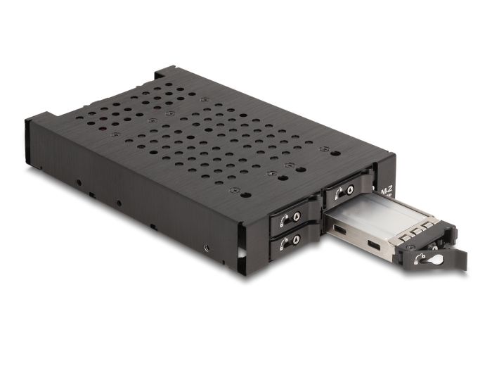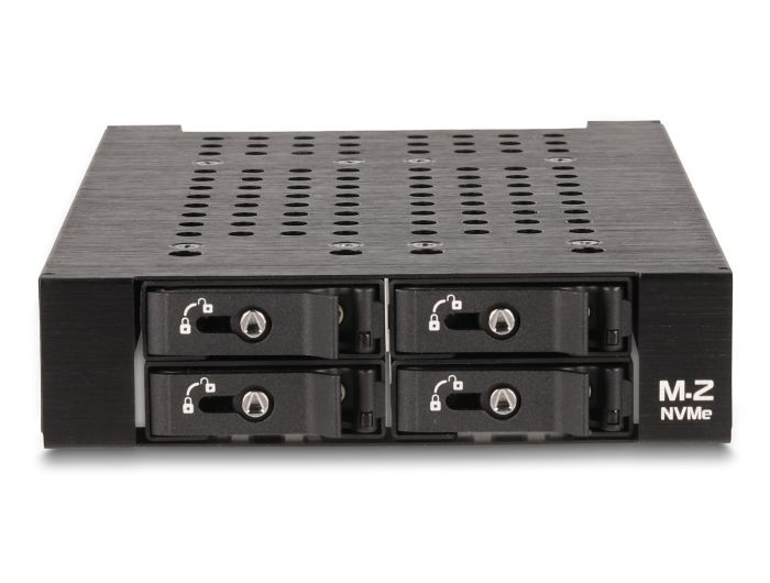 Tento pevný kovový mobilní rack značky Delock lze nainstalovat do 3.5” pozice na PC a poskytuje čtyři sloty M.2 ve formátu 2280, 2260, 2242 nebo 2230. Rychlá výměna SSD Díky speciálnímu mechanismu lze SSD rychle a snadno vyměňovat. Například lze vyndat datové zálohy a uložit je na bezpečném místě. Tác se zamykáním na klíč a s pružinami Výmenný rámeček je vybaven zámkem, aby se zabránilo neoprávněnému přístupu. Stabilní nosič z kovu má nahoře a vespod pružiny, které omezují vibrace a tím podporují jeho používání ve světě mobilních zařízení. Poznámka Je třeba obzvlášť pečlivě zajistit, aby byla disková mechanika zasunuta až na doraz, jinak nebude možné navázat spojení s SSD. Technické detaily Konektor: Mobilní rámeček: interní: 4 x M.2 klíč M slot externí: 4 x Slim SAS SFF-8654 4i samice 4 x 4 pin Floppy samec 4 x 2 pinový konektor pro ventilátoru Zásobník M.2: 1 x M.2 klíč M samec 1 x M.2 klíč M slot Kompatibilní s PCI Express V4.0 Rozhraní: PCIe / NVMe Podporuje M.2 moduly ve formátu 2280, 2260, 2242 a 2230 s klíčem M nebo klíčem B+M na základě PCIe Maximální výška komponentů na modulu: 1,5 mm je podporována aplikace oboustraných modulů 4 x LED indikující Bootovatelný, od UEFI verze 2.3.1 Kovový zásobník M.2 Podporuje NVM Express (NVMe) Podporuje S.M.A.R.T. Zámek s klíčem Rozměry (DxŠxV): cca. 159 x 100 x 25 mm Systémové požadavky Linux Kernel 6.2 nebo vyšší Windows 10/10-64/11 Windows Server 2022 PC s volnou 3.5” pozicí Jeden volný port Slim SAS SFF-8654 pro každý slot M.2 Napájecí zdroj s volným SATA napájecím konektorem Obsah balení 3.5”Mobilní rámeček s 4 x zásobník M.2 2 x kabely SATA, 15 pinové, na 2 x 4 pinové zásuvky disketové mechaniky, délka cca. 12 cm 2 x klíč 4 x šrouby I 6,0 x 5,0 mm, s hlavou 8,0 mm 4 x šrouby IM 2,0 x 4,0 mm, s hlavou 5,0 mm Uživatelská příručka Balení Box |