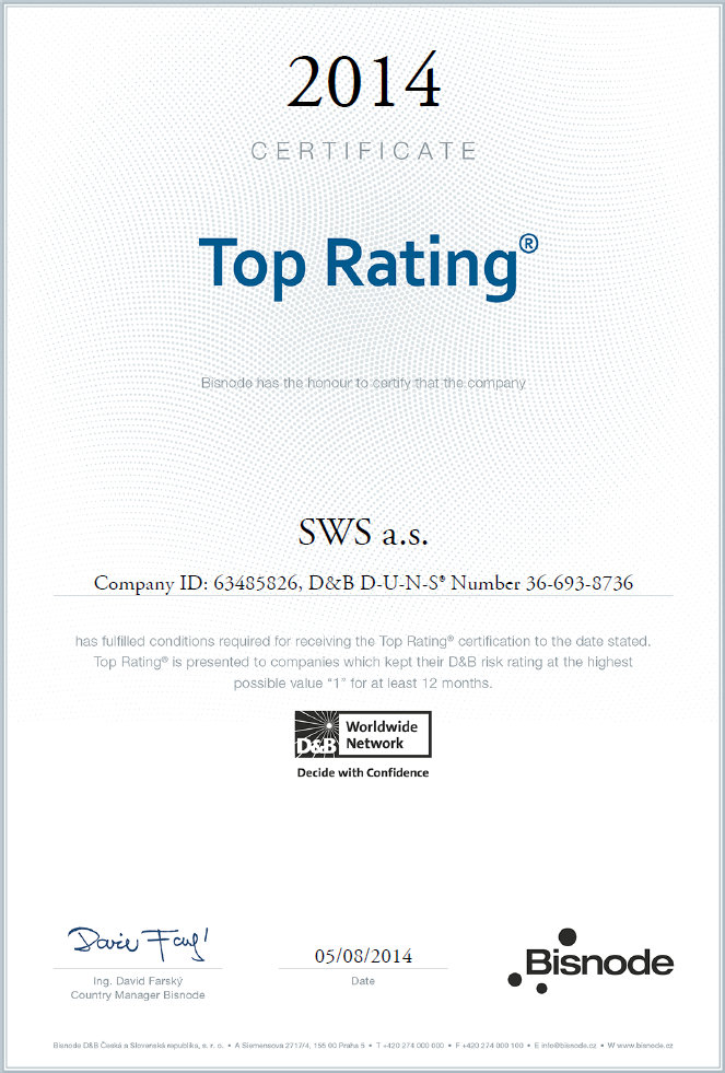 Společnost Bisnode Česká republika, a.s. udělila SWS a.s. prestižní ocenění za stabilitu společnosti. Ve vyhodnocení získala nejvyšší možný stupeň „AAA“, čímž se zařadila mezi nejstabilnější společnosti v České republice i zahraničí.